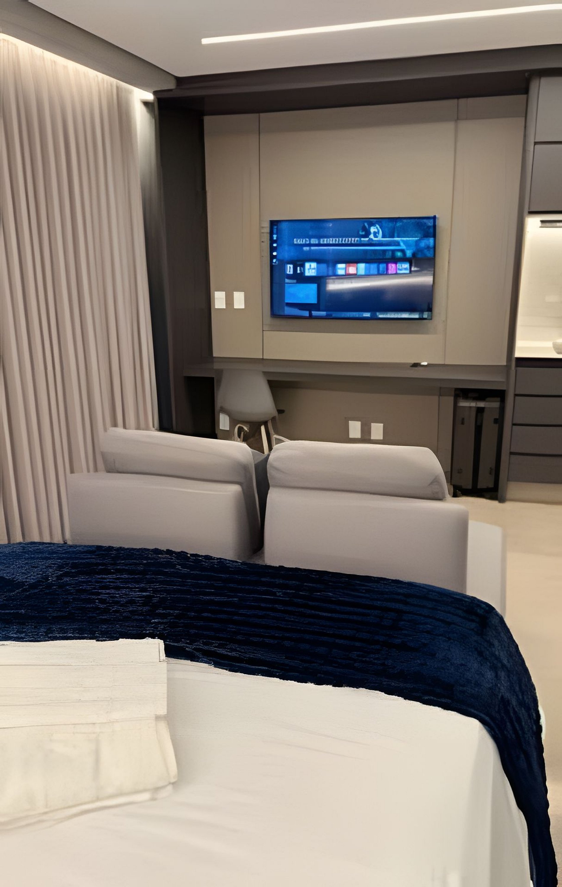 O flat conta com ambientes espaçosos, modernos e mobiliário de alto padrão, ideal para quem busca praticidade sem abrir mão da elegância: Cama queen super confortável, com enxoval completo padrão hotelaria. Ar-condicionado para climatizar seus momentos de descanso. Cozinha totalmente equipada com utensílios. Banheiro sofisticado, com secador de cabelo, itens de banho de qualidade e toalhas macias. Wi-Fi de alta velocidade para trabalho ou lazer. Smart TV de alta definição com acesso a serviços de streaming. Estacionamento incluso para maior comodidade